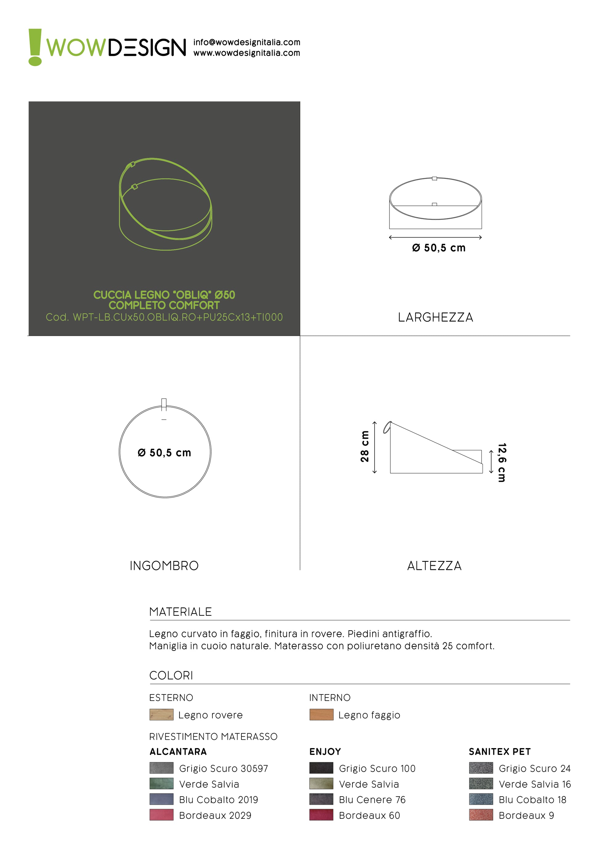 WOW! cuccia della collezione 'CURV-OBLIQ' diametro 50cm in legno finitura rovere, è progettata sia per il comfort del nostro amico animale di taglia piccola (materasso con spessore generoso studiato per la morbidezza, mantenendo il giusto supporto, che normalmente viene utilizzato nei miglior arredamenti casa), sia per il design funzionale del legno curvato con 'spalliera' elegante che protegge il materasso e dona un estetica particolare all' ambiente che lo circonda. I tessuti da interni sono sfoderabili e lavabili, e sono selezionati per la loro bellezza e qualità, con dettagli in cuoio che rendono la tua cuccia un elemento integrabile al tuo arredo casa, e che valorizza tutti i tipi di ambienti.
