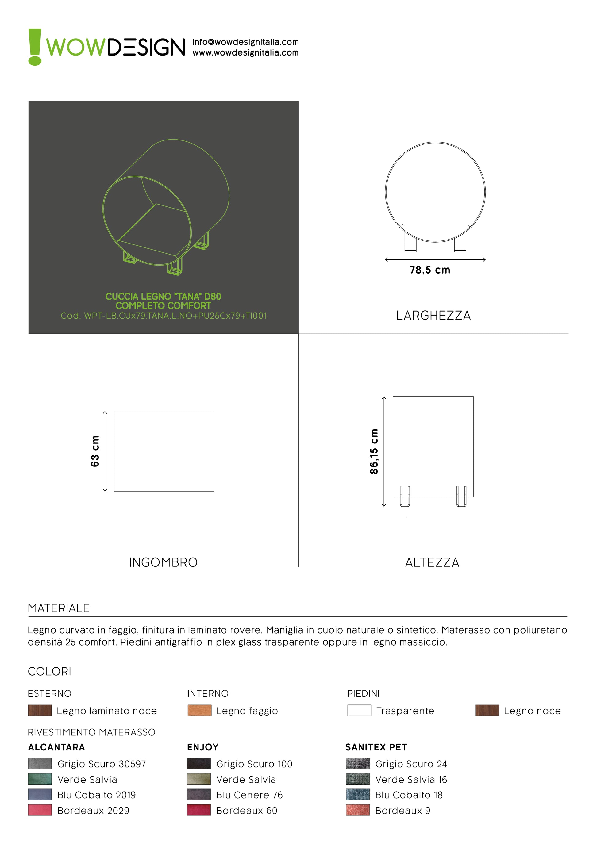 La cuccia della collezione TANA diametro 80cm, laminato in faggio con finitura noce, è progettata sia per il comfort del nostro amico animale di taglia medio-grande, (mantenendo un ampio supporto che normalmente viene utilizzato nei migliori arredamenti casa), sia per il design funzionale del legno curvato che dona un'estetica particolare all'ambiente che lo circonda. I tessuti da interni sono sfoderabili e lavabili, sono selezionati per la loro bellezza e qualità, con dettagli in cuoio che rendono la tua cuccia un elemento integrabile al tuo arredo casa e che valorizza ambienti eleganti o moderni.